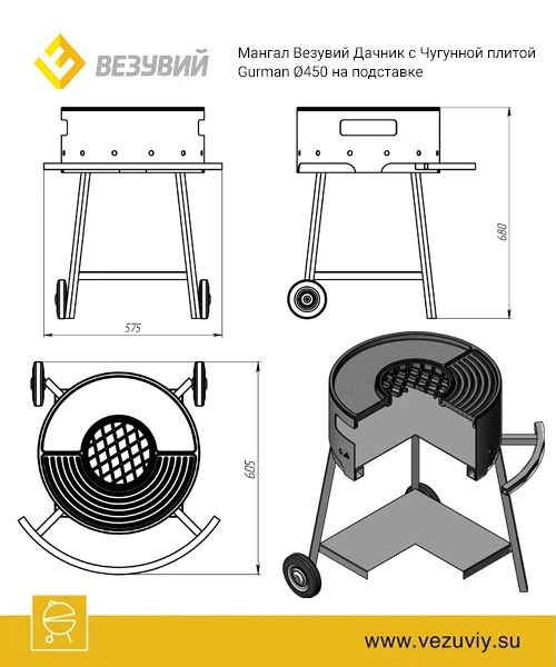 Мангал Везувий "Дачник" с чугунной плитой "Gurman" D=450 мм на подставке